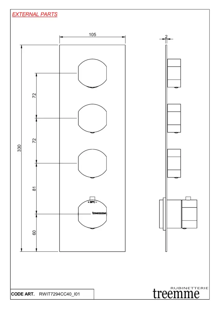 Treemme Hedo Смеситель для душа термостатический встраиваемый, 3 потреб., внешняя часть, цвет:chrome RWIT7294CC40