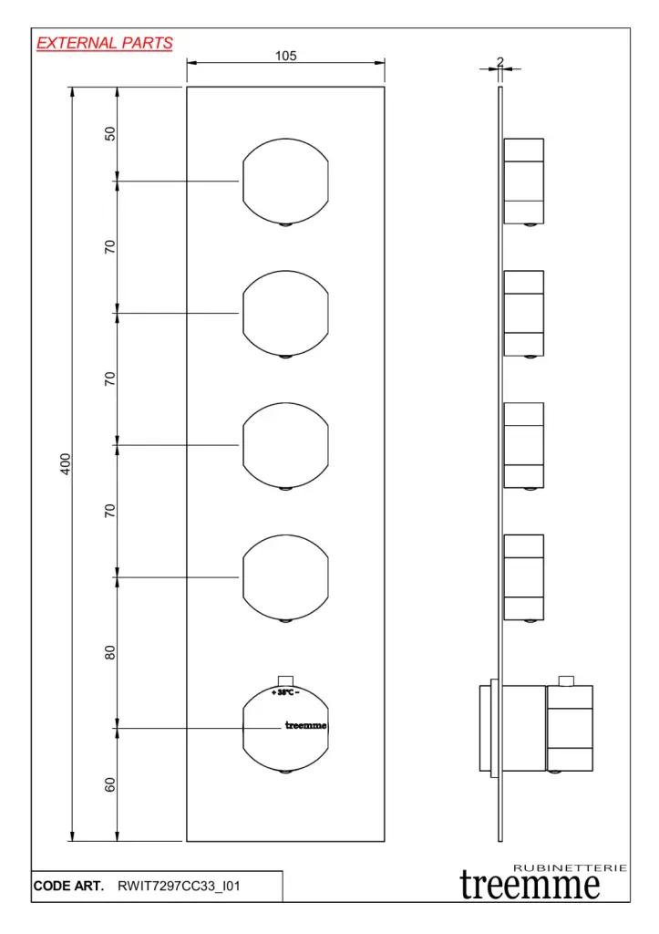 Treemme Hedo Смеситель для душа термостатический встраиваемый, 4 потреб., внешняя часть, цвет:chrome RWIT7297CC33