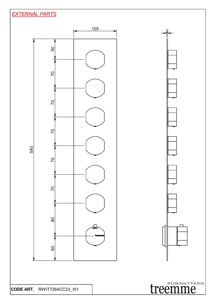 Treemme Hedo Смеситель для душа термостатический встраиваемый, 6 потреб., внешняя часть, цвет:chrome RWIT7264CC33