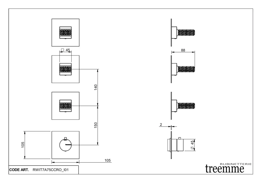 Treemme Kea Смеситель для душа, термостат, встраиваемый, на 2 потока, цвет: хром RWIT7AD5CC01