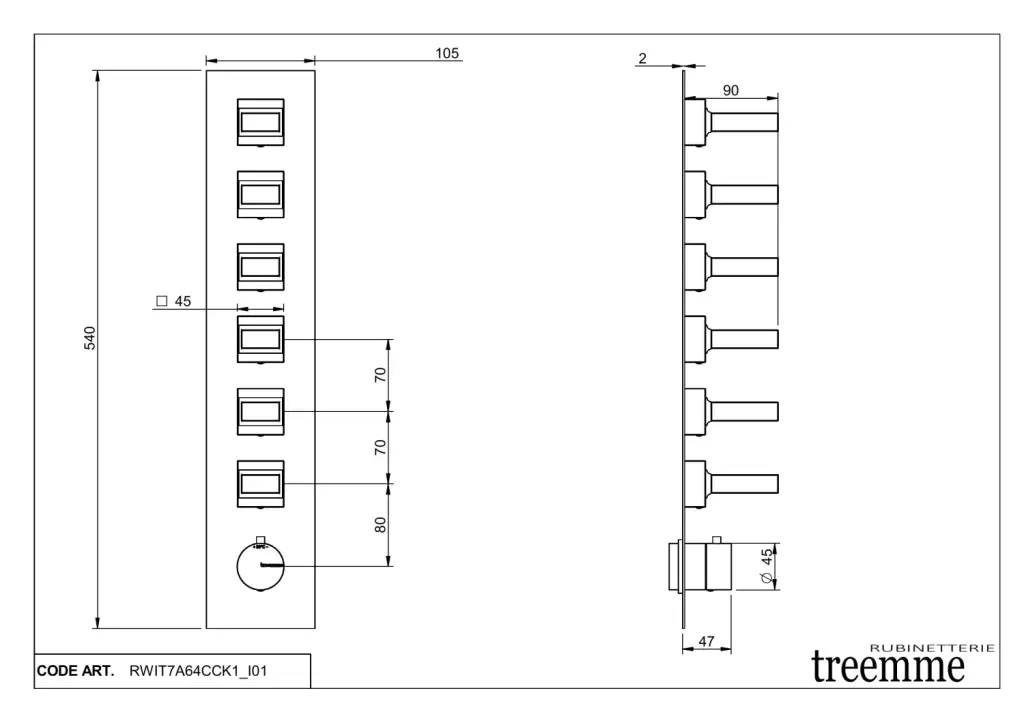 Treemme Kea Смеситель для душа, термостат, встраиваемый, на 2 потока, цвет: хром RWIT7AD5CC01