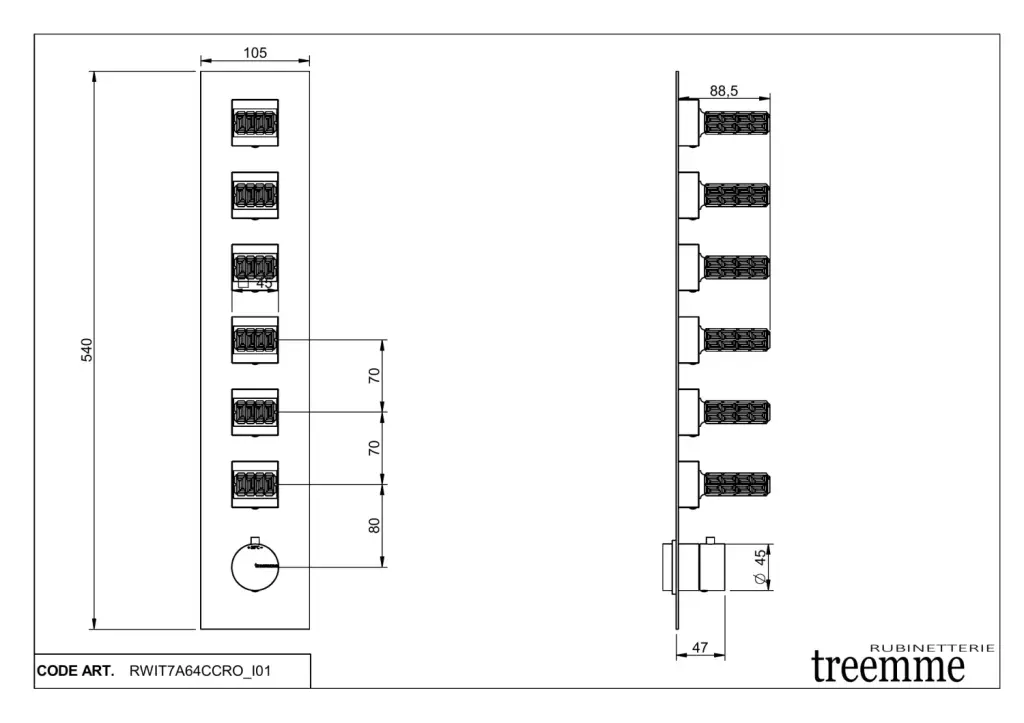 Treemme Kea Смеситель для душа термостатический встраиваемый, 6 потреб., внешняя часть, цвет: chrome RWIT7A64CCR_