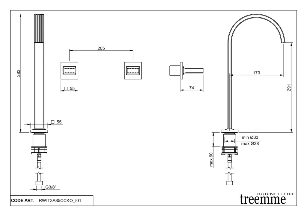 Treemme Kea Внутренняя часть встраиваемого смесителя для раковины на 3 отверстия RWIT7A52ZZ02