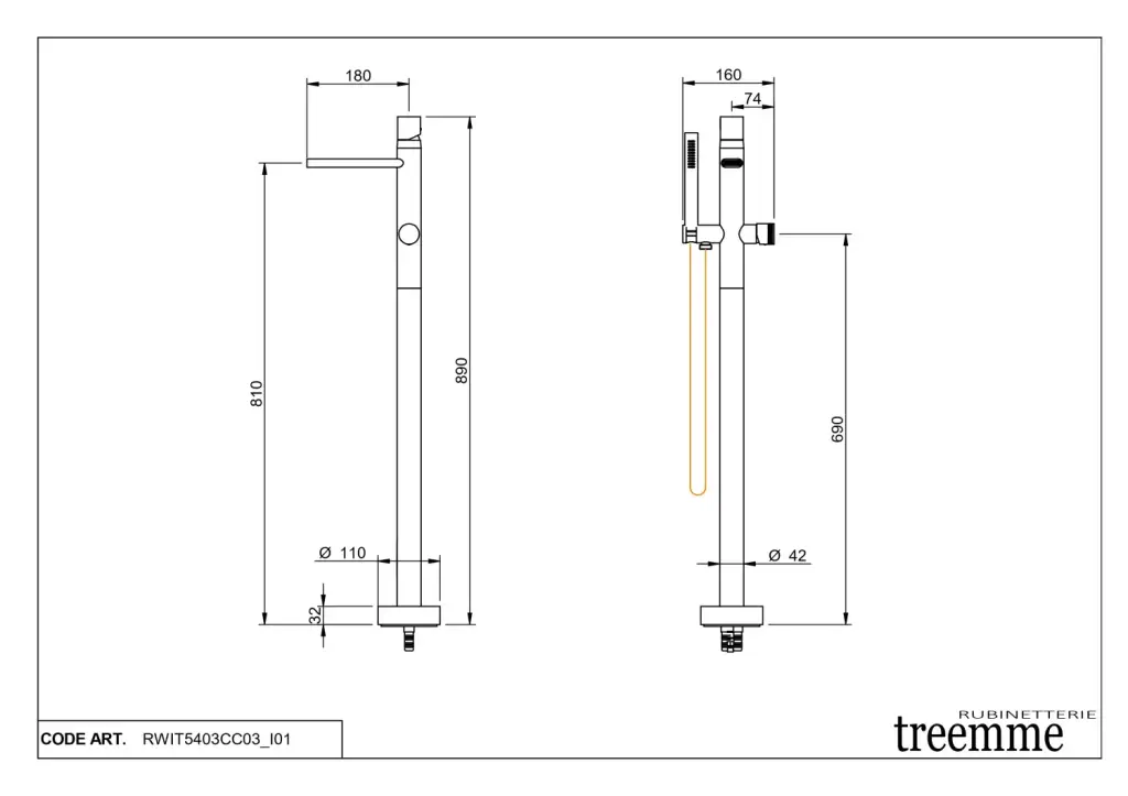 Treemme Nanotech Смеситель для ванны напольный с ручным душем и шлангом, цвет: chrome RWIT5403CC03