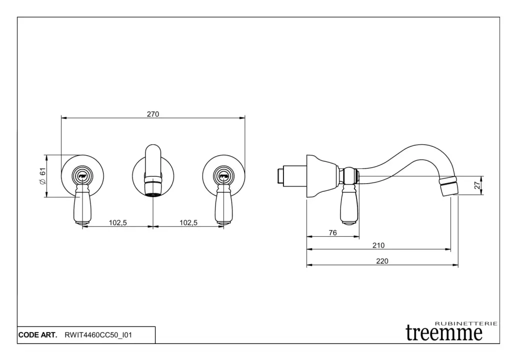 Treemme Old Italy Смеситель для раковины на 3 отверстия, с д/к, длина излива 13 см, цвет: chrome IT4410CCOIZZ