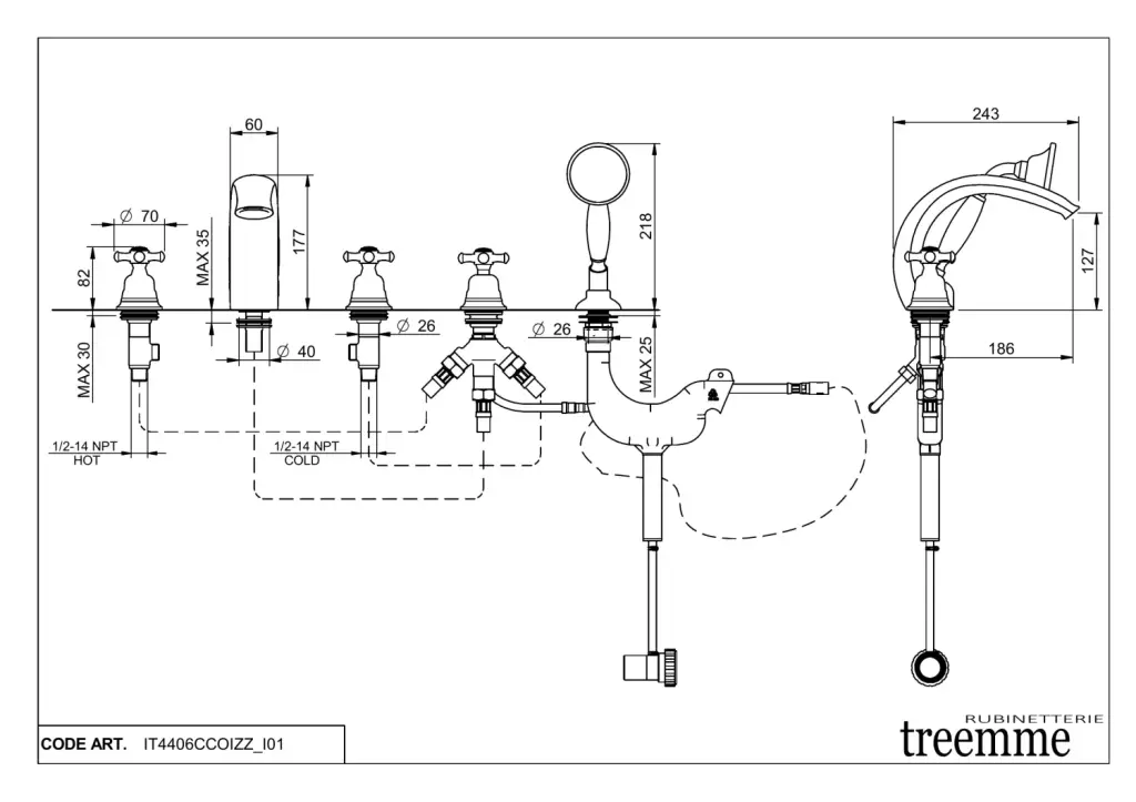 Treemme Old Italy Смеситель на борт ванны на 5 отверстий, с ручным душем, внешняя часть, цвет:chrome IT4406CCOIZZ