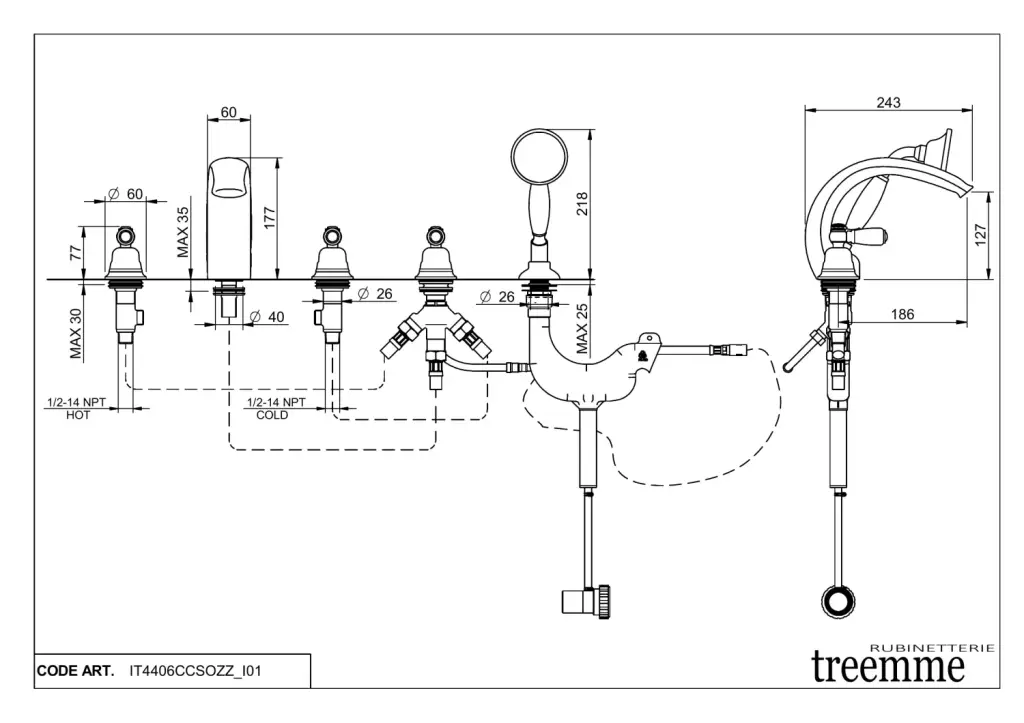 Treemme Old Italy Смеситель на борт ванны на 5 отверстий, с ручным душем, внешняя часть, цвет:chrome IT4406CCSOZZ