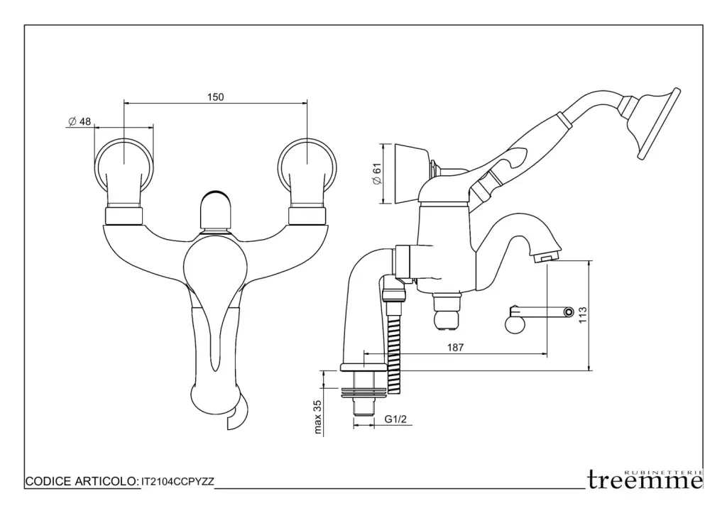 Treemme Piccadilly Смеситель на борт ванны на 2 отверстия, с ручным душем, внеш. часть, цвет: chrome IT2104CCPYZZ