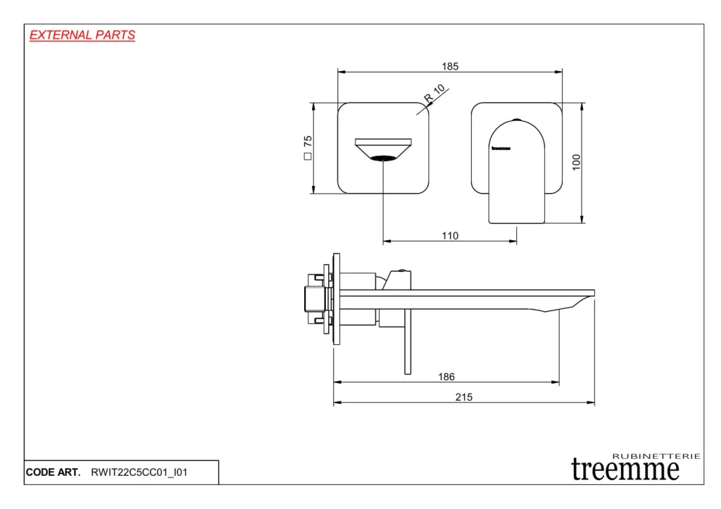 Treemme Ran Смеситель для раковины встраиваемый, внешняя часть, излив 18,6 см, цвет: chrome RWIT22C5CC01