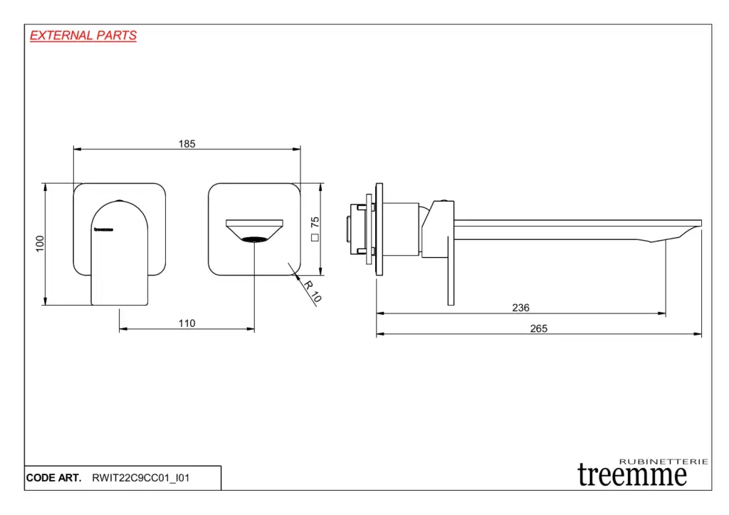 Treemme Ran Смеситель для раковины встраиваемый, внешняя часть, излив 23,6 см, цвет: chrome RWIT22C9CC01