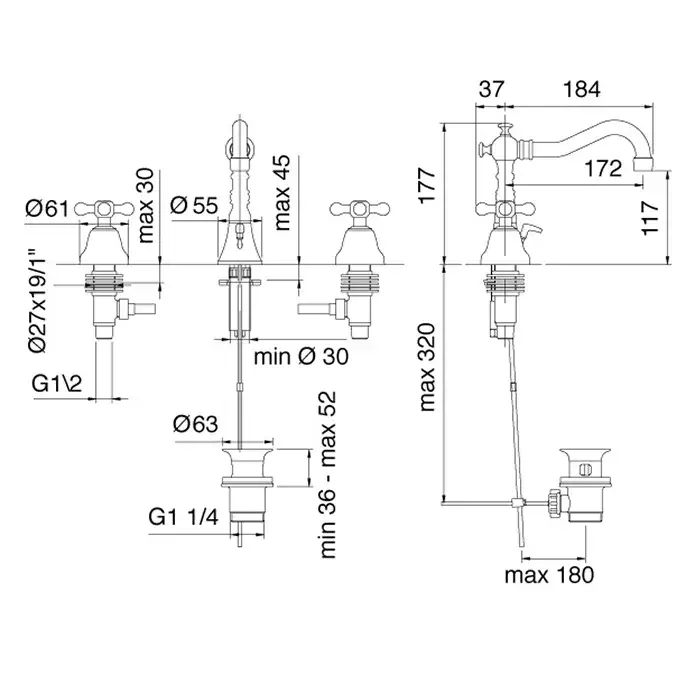 Treemme Romantica Смеситель для раковины на 3 отверстия, ручки PV, цвет: хром/керамика 3617CCPV