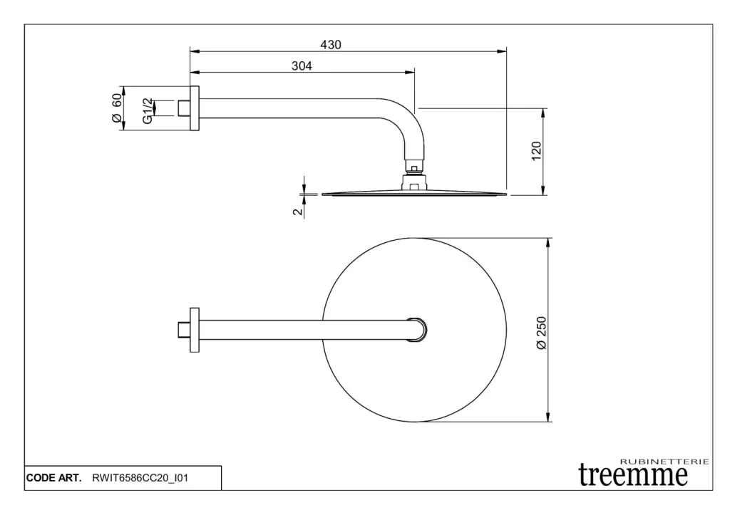 Treemme Shower Верхний душ d25,5 см, 1 вид струи, кронштейн 30,4 см, цвет: chrome RWIT6586CC20