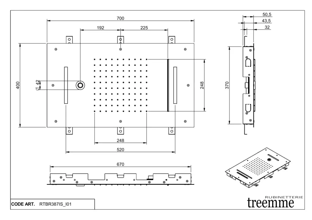 Treemme Showers Inox Потолочный душ встр. 70x40см, 3 вид струи, хромотерапия, цвет:нержавеющая сталь ITRTBR387IS