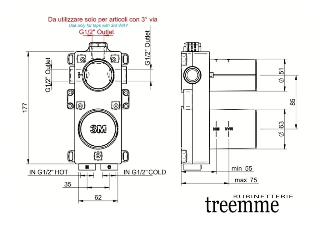 Treemme 3.6MM Смеситель для ванны/душа с перекл. на 3 вых., встраив., цвет: нерж. сталь RWIT9AE3IS02