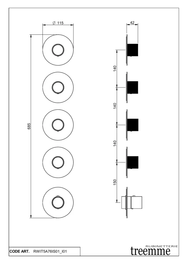 Treemme Watertube Смеситель для душа термостатический встраив., 4 потреб., цвет: нержавеющая сталь RWIT5A76IS01