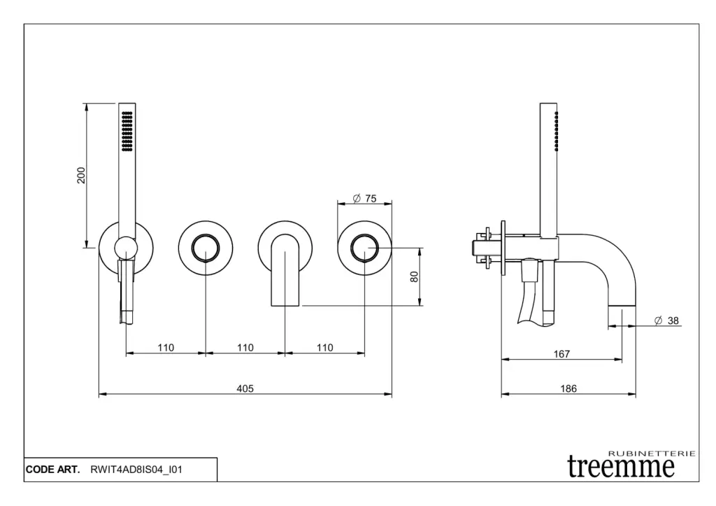 Treemme Watertube Смеситель для душа встраиваемый, 2 потреб., внешняя часть, цвет: нержавеющая сталь RWIT4AD8IS04