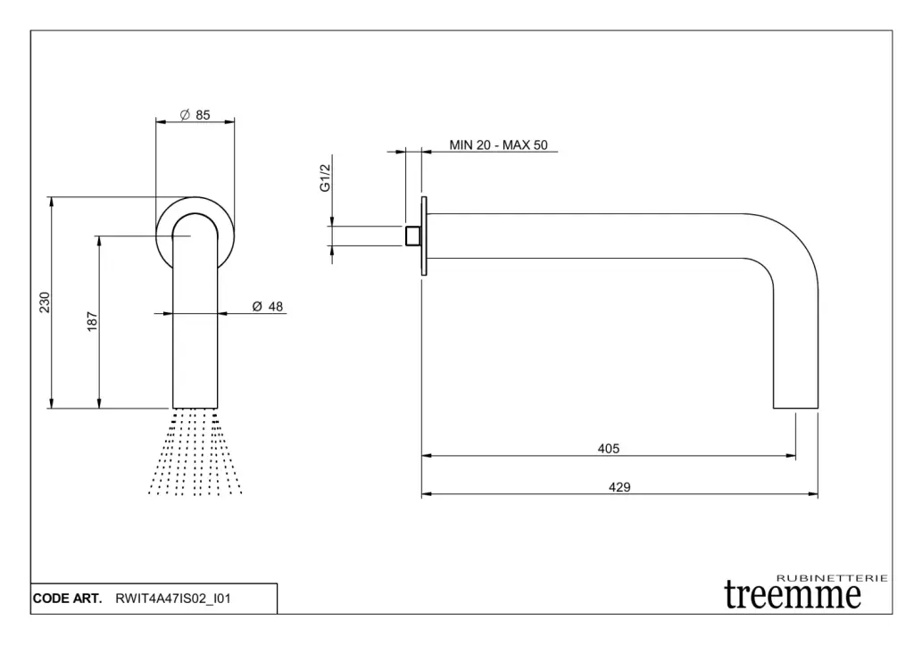 Treemme Watertube Верхний душ 8,5x42,9 см, 1 вид струи, цвет: нержавеющая сталь RWIT4A47IS02