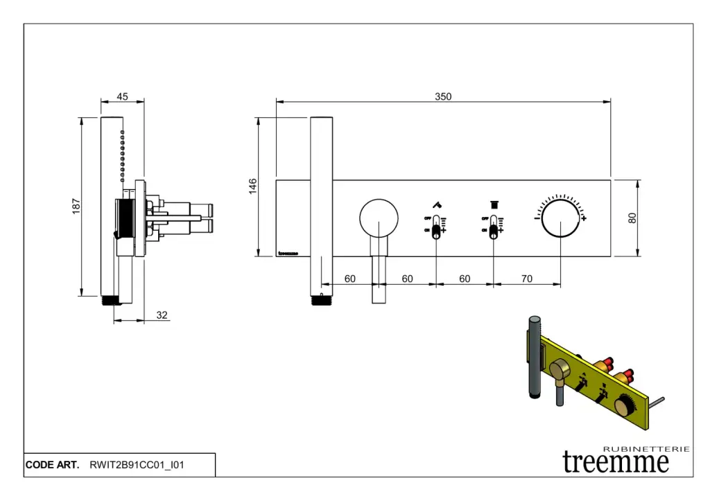 Treemme Watt Смеситель для душа термостат. встр., 2 потреб., внешняя часть, цвет: нержавеющая сталь RWIT2B91IS01
