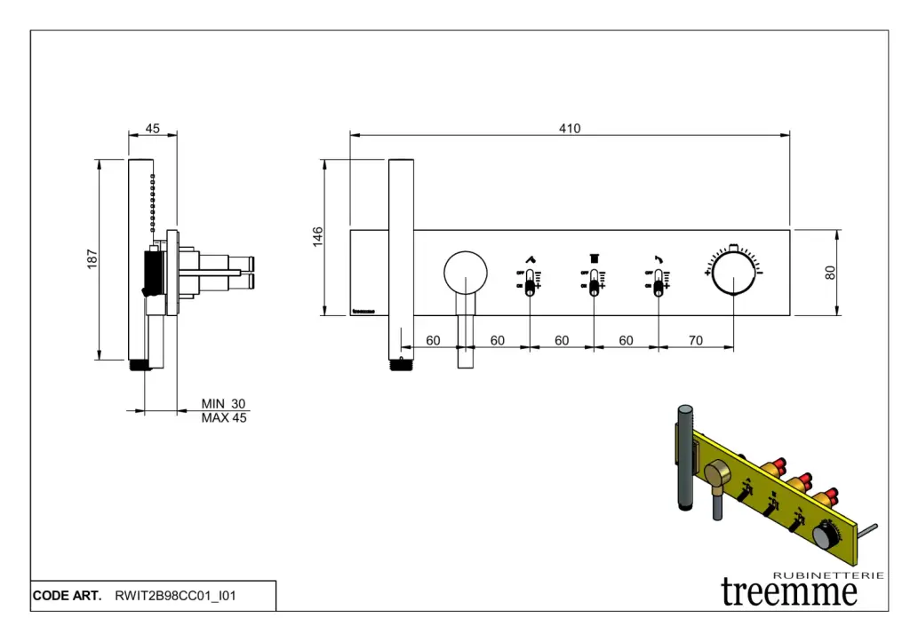 Treemme Watt Смеситель для душа термостат. встр., 3 потреб., внешняя часть, цвет: нержавеющая сталь RWIT2B98IS01