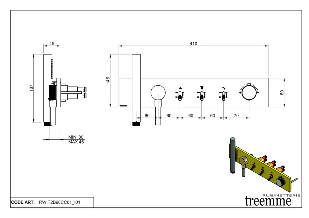 Treemme Watt Смеситель для душа термостатический встраиваемый, 3 потреб., внешняя часть, цвет:chrome RWIT2B98CC01