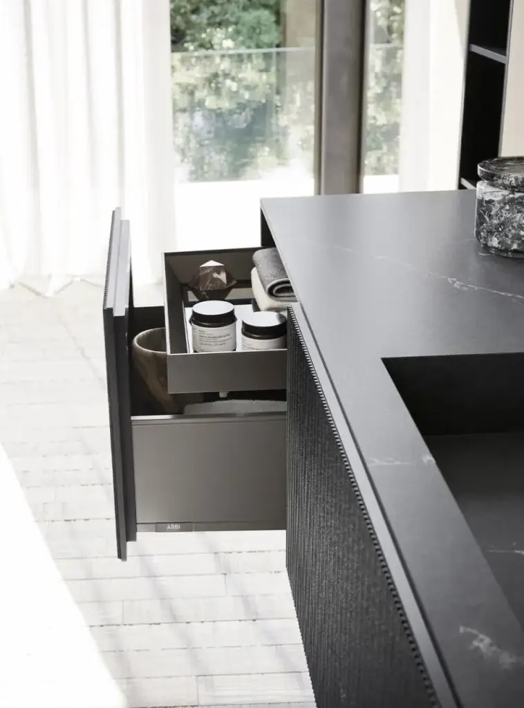 Тумба для ванной комнаты Arbi LUXOR B833 фронт-QUARZO RESINA MILLERIGHE CHARCOAL-LX8, корпус-GRIGIO BROMO OPACO-900CW, рама-NERO SPAZZOLATO