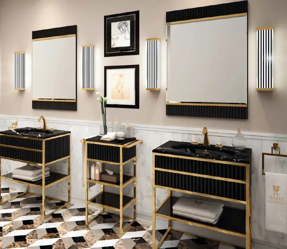 Тумба для ванной комнаты Oasis ACADEMY 0AC1PTA08439050OR + 0ACTTS000239036LMQ декор - ribbed nero, профили - золото, мрамор - nero marquina