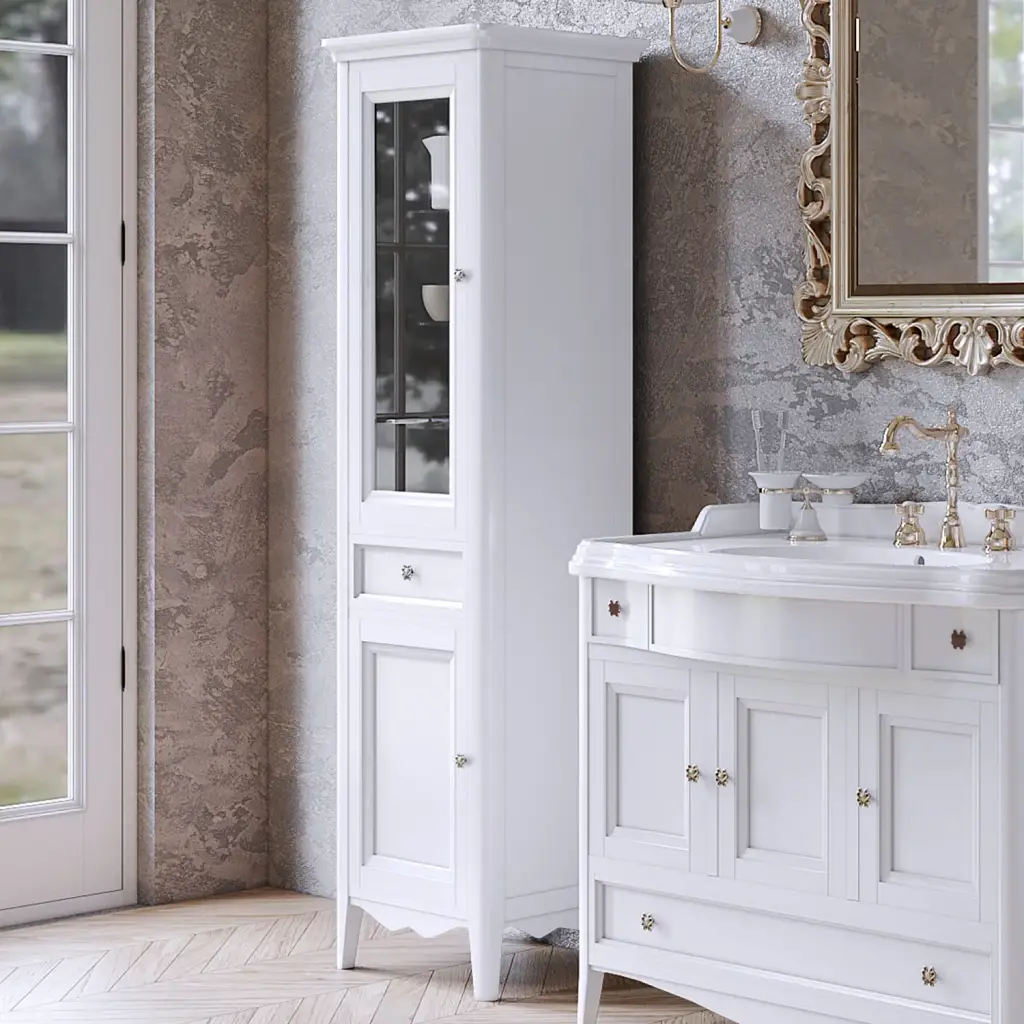 TW Veronica Nuovo Колонна напольная с 2-мя дверцами, 1-м выдвижным ящиком, 3-мя стеклянными полками, доводчиками Blum, ручки бронза, SX - петли слева, Цвет: bianco decape