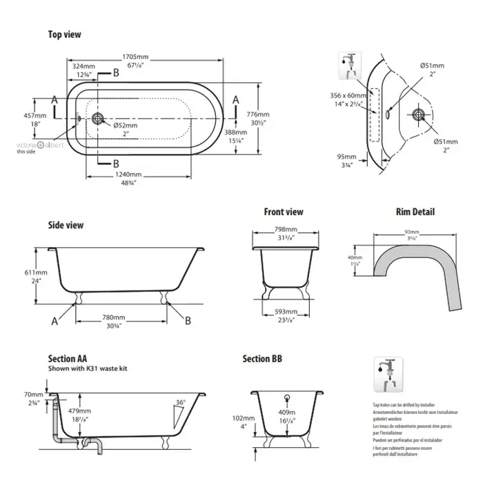 Victoria + Albert Hampshire Ванна, 170х78 см, цвет: белый HAM-N-SW-OF+FT-HAM-BN