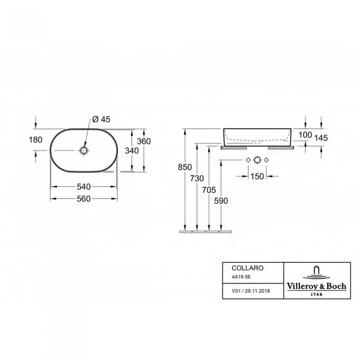 Villeroy&Boch Collaro Раковина накладная, 56x36х14.5см., без отв., цвет: альпийский белый