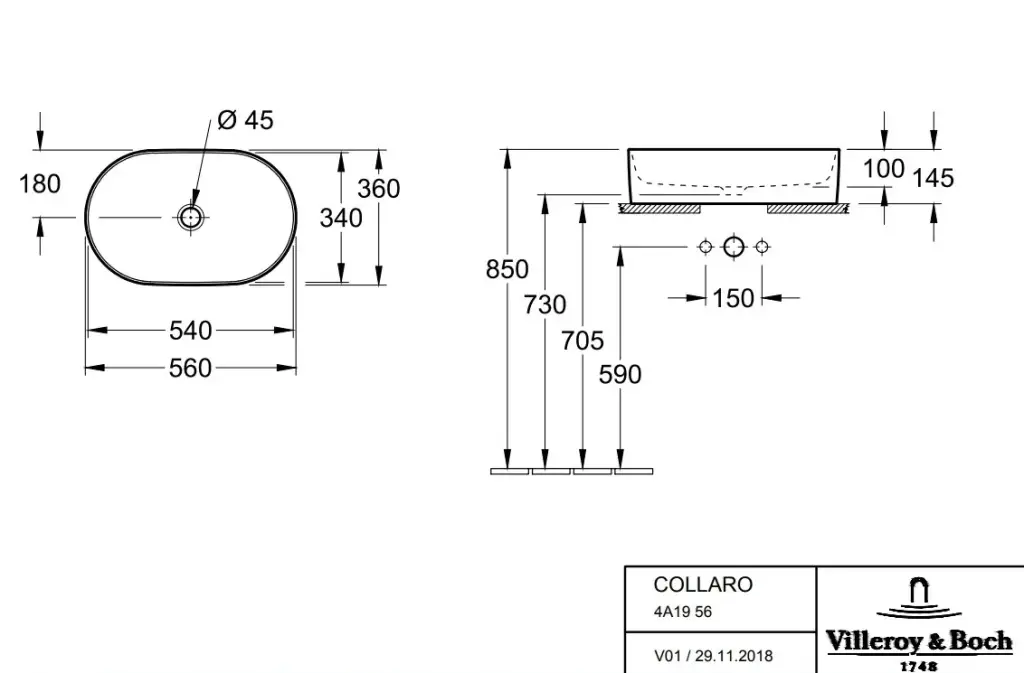Villeroy&Boch Collaro Раковина накладная, 56x36х14.5см., без отв., цвет: альпийский белый