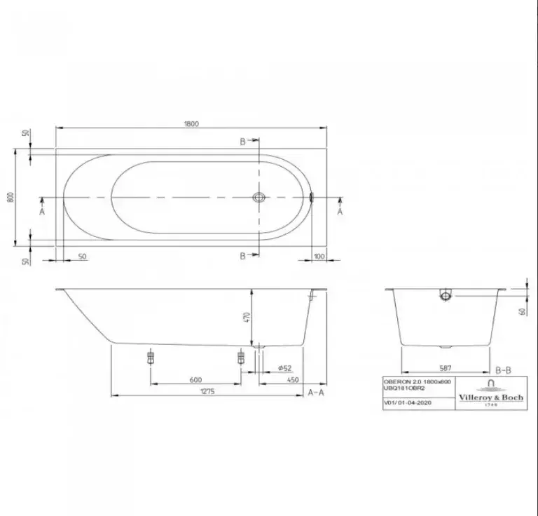 Villeroy & Boch Oberon 2.0 Ванна 180х80 см, встраиваемая, цвет: белый UBQ181OBR2DV01