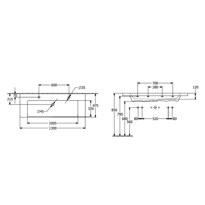 Villeroy & Boch Subway 3.0 Раковина 130х47х17 см, 2 отв., подвесная, цвет: альпийский белый 4A70D1R1