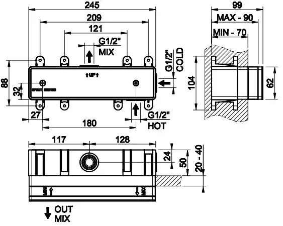 Встраиваемая часть для смесителя на 2 выхода 24,5*9,9*h8,8 Chrome