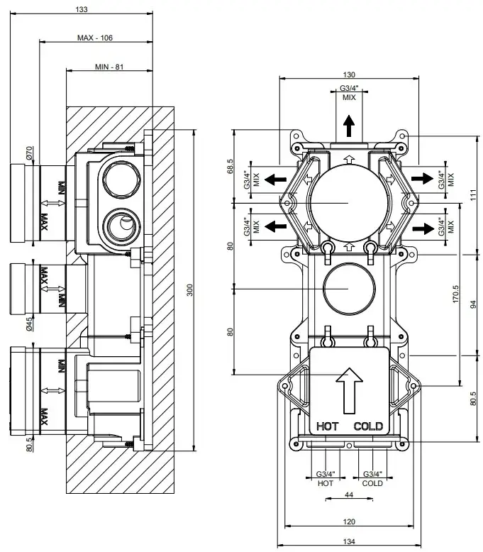 Gessi Rettangolo Смеситель для душа, встраиваемый, термостатический, подключение на 3/4", с 4мя независимыми выходами, внешняя часть, цвет: Black XL