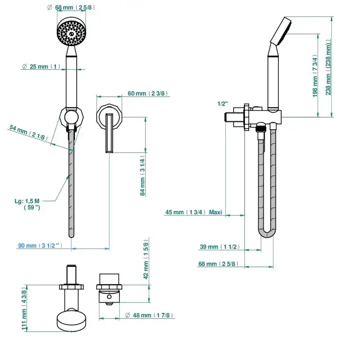 THG Les Ondes Душевой гарнитур: с ручным душем, настенным держателем, подводом воды и шлангом 150см., цвет: Matt nickel