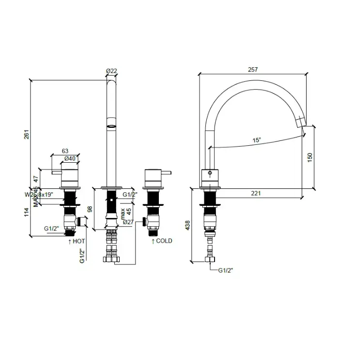 ALMAR Смеситель для раковины на 3 отверстия без донного клапана, цвет латунь брашированная PVD