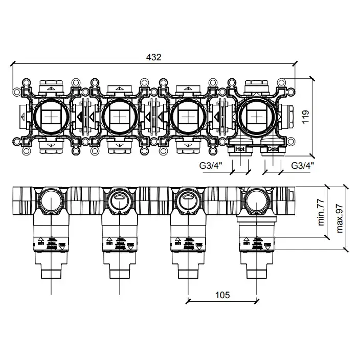 ALMAR Встраиваемая часть термостатического смесителя на 3 потребителя, горизонтальный модуль