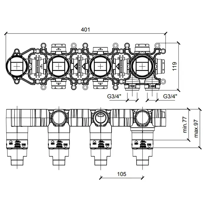 ALMAR Встраиваемая часть термостатического смесителя с переключателем на 2 положения, горизонтальный модуль
