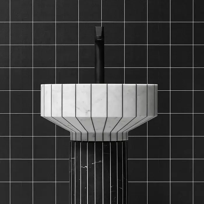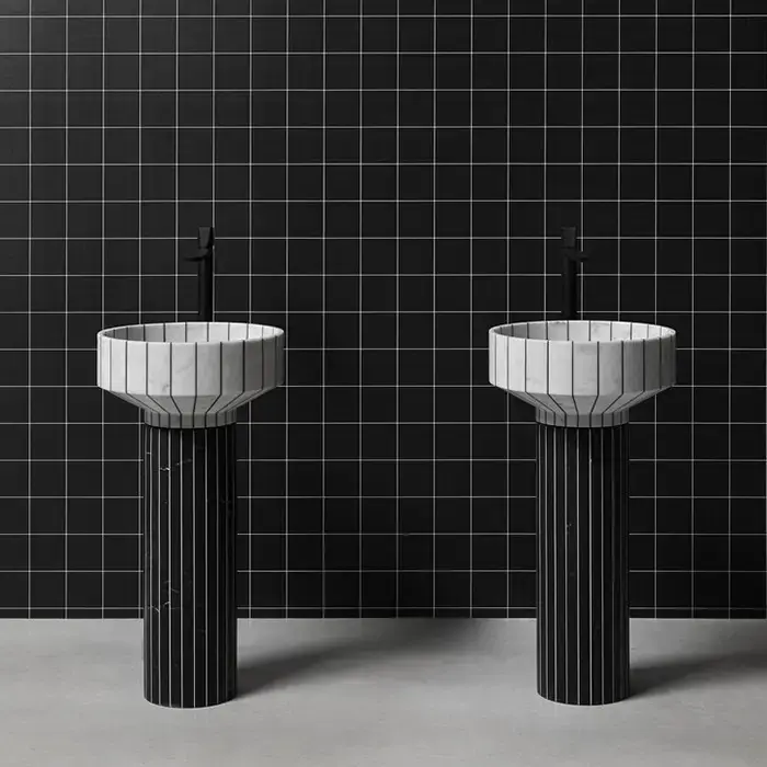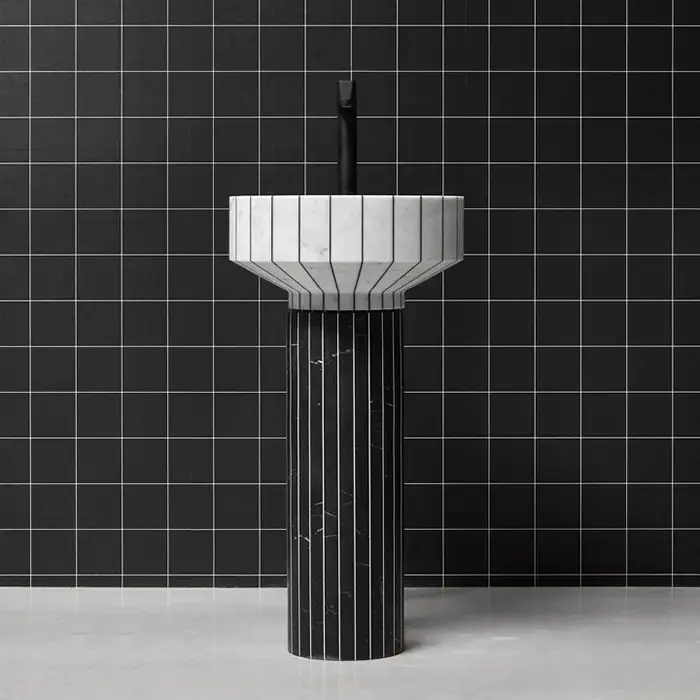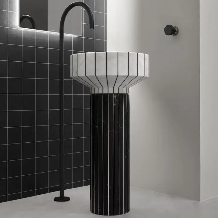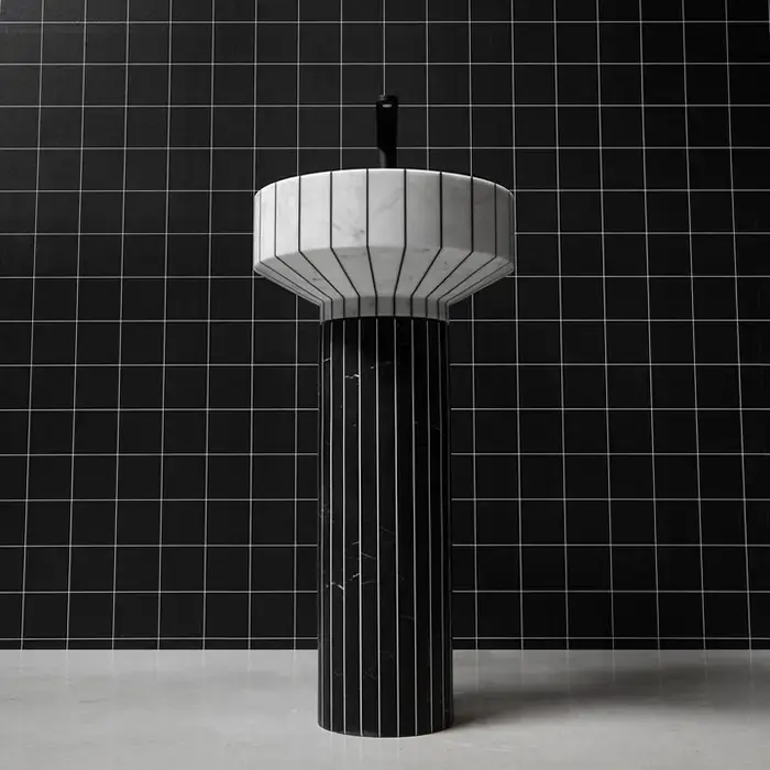 ANTONIO LUPI 024 Раковина напольная Ø450х850 мм., слив в пол, с сифоном, гибким шлангом и донным клапаном, пьедестал Nero Marquinia, раковина Carrara