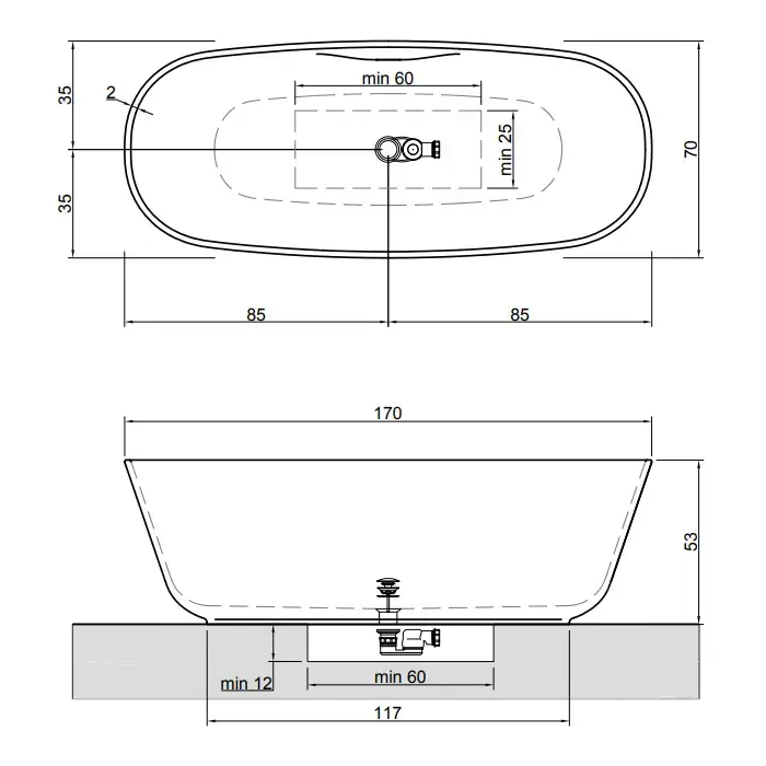 ANTONIO LUPI BAIA SMALL Ванна отдельностоящая 1700х700х530 мм., с нажимным донным клапаном, сифоном и гибким шлангом, Cristalplant, цвет белый