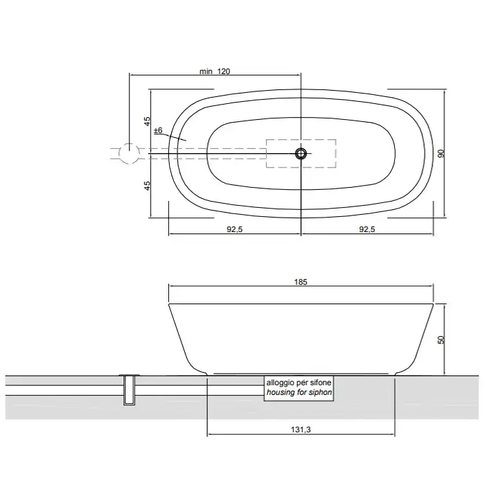 Antonio Lupi Baia Ванна отдельностоящая 185х90х50 см с д/клапаном (хром), без перелива, без сифона, мат-л : нат.камень, цвет: Pietra Stone Grey