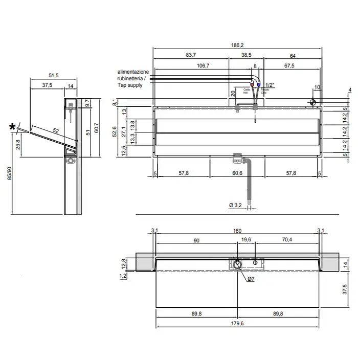 ANTONIO LUPI BATTIGIA Раковина встраиваемая в стену 1800х515х607 мм, с подсветкой, смеситель, донный клапан, сифон, Corian, мрамор Carrara, цвет белый
