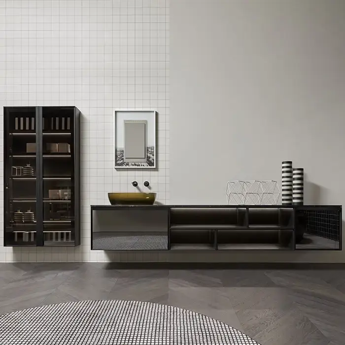ANTONIO LUPI BEMADE Пенал 450х216х1750 мм, подв, левый, 1 дверца, 5 полок с подсв, бок слева Rovere ardesia, рама Nero matt, фронт стекло Reflect fume