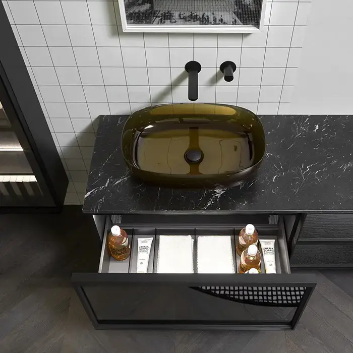 ANTONIO LUPI BEMADE Тумба под раковину 720х540х500 мм, 1 ящик, внутр подсветка, бок слева Rovere Ardesia, рама черный мат, фронт стекло Argentato fume