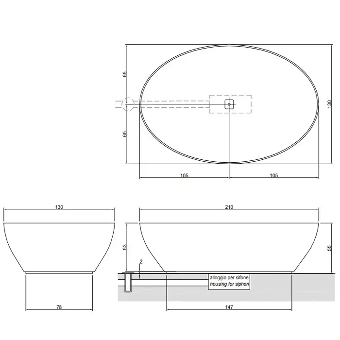 ANTONIO LUPI SOLIDEA Ванна отдельностоящая 2100х1300х550 мм., с нажимным донным клапаном, мрамор Nero Marquinia