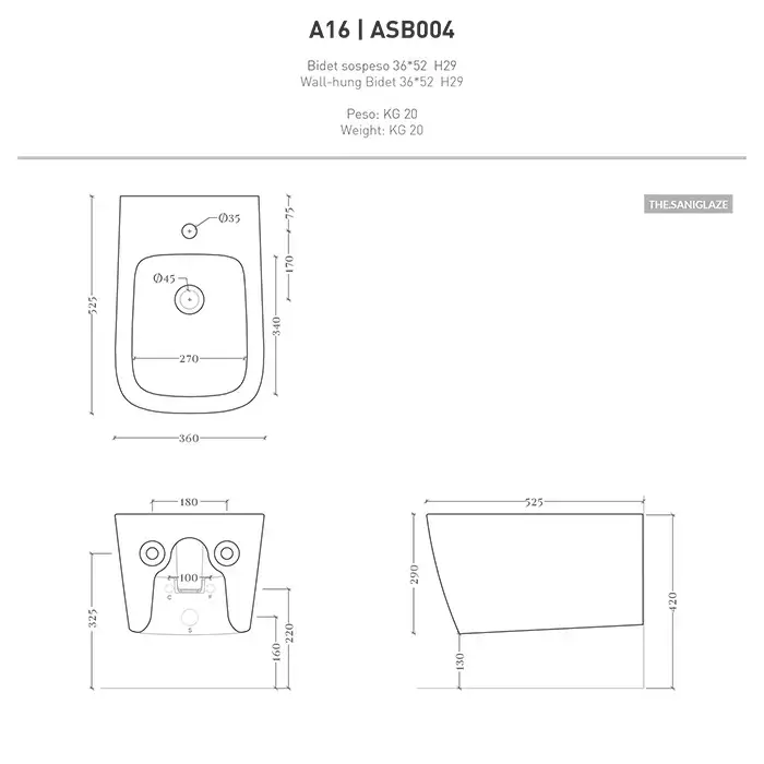 Artceram A16 Биде подвесное 36х52 см, с 1 отв под смеситель, с креплениями, цвет белый. SANIGLAZE