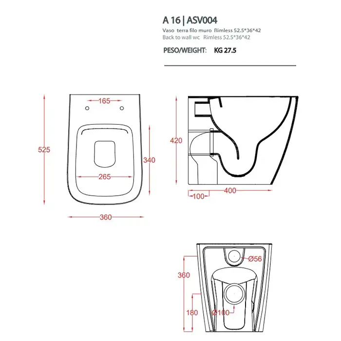 Artceram A16 Унитаз безободковый, напольный приставной слив универсальный 36х52 см, с креплениями, цвет белый.
