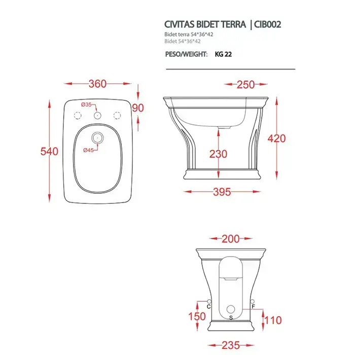 Artceram CIVITAS Биде напольное 36х54 см, с 1 отв под смес, цвет белый (крепится на силикон)