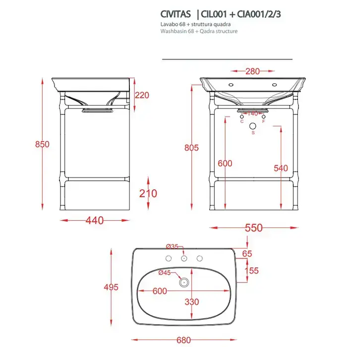 Artceram CIVITAS Структура металлическая Quadra для раковины 68 см, полка стекло, цвет хром