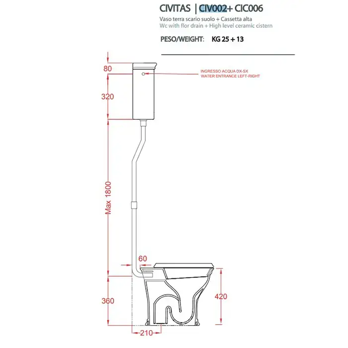 Artceram CIVITAS Унитаз 36х54см., с высоким бачком и трубой хром, с механизмом с цепочкой и ручкой, с сиденьем, микролифт, цвет: белый